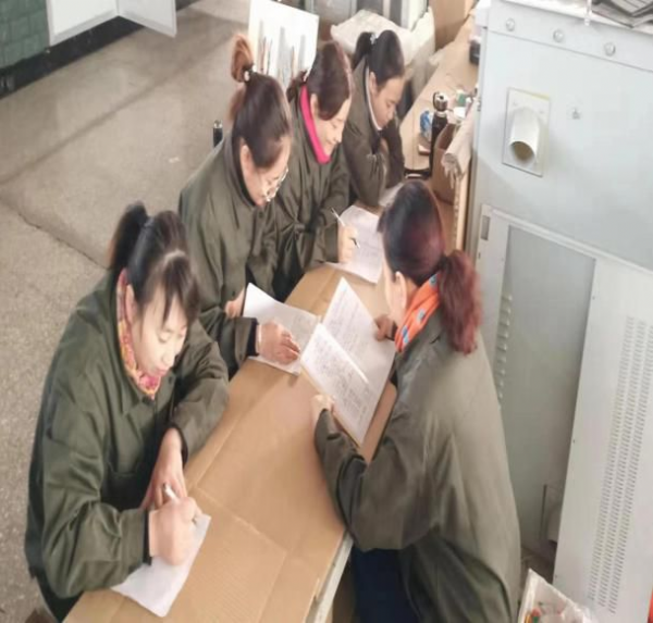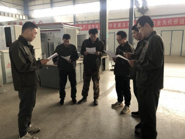 各个班组内组织的学习。开关柜车间一二次班班长正在把自己所学到的培训内容讲解给自己的组员学习。组员们认真倾听,认真记录。