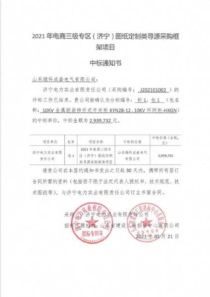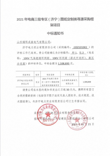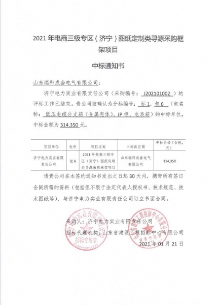另外,在2021年电商三级专区(济宁)图纸定制类寻源采购框架项目中,我公司顺利入围3个标段;2021年电商三级专区图纸定制类寻源采购框架项目(烟台)中,我公司顺利入围2个标段,几个项目的中标、入围,是对我公司综合实力,技术水平的又一次肯定,也是客户对我们产品的认可。我们将会付出更多的努力,乘胜前进,争创更好的成绩。